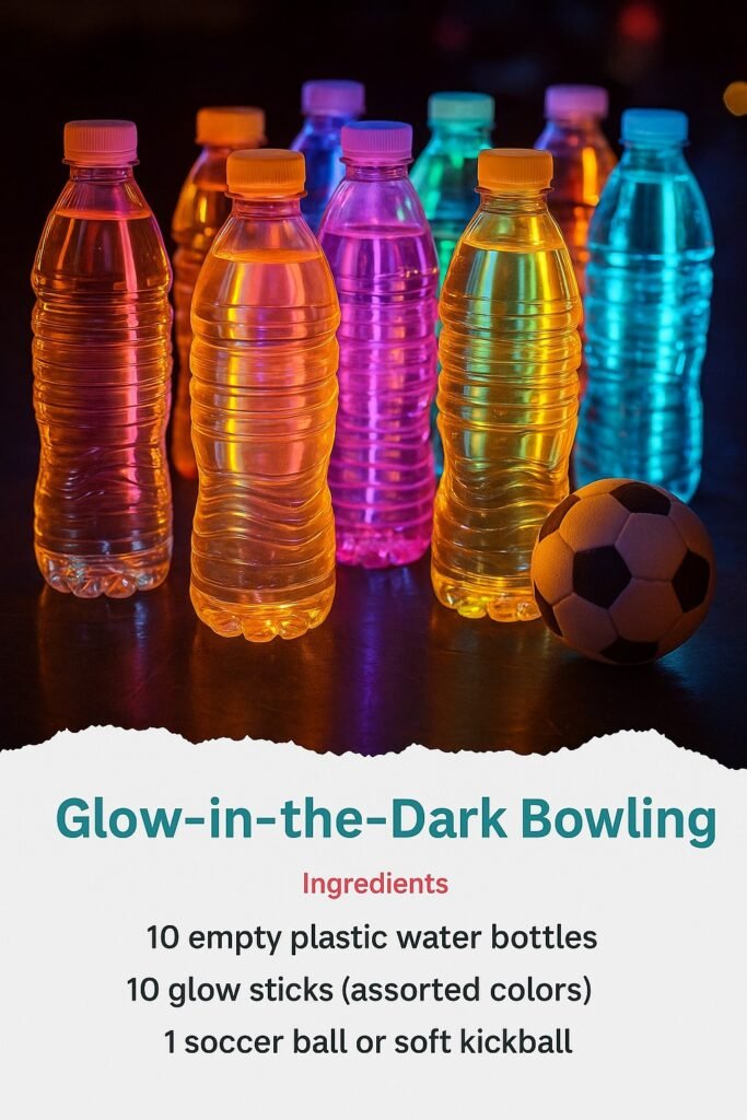 7. Take your soccer ball or soft kickball and roll it towards the glowing pins for a fun bowling experience. Don’t forget to keep track of your score!
