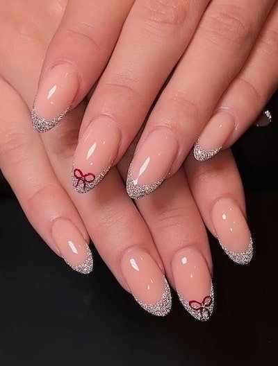 French nails with glittered tips that catch the light beautifully, accented by delicate small bow details for a charming and feminine finish. A perfect blend of sparkle and sweet sophistication.