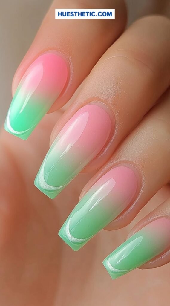 Soft pink to green ombre nails blend delicate femininity with a fresh pop of color. This dreamy gradient shifts from blush tones to minty or mossy greens, creating a serene, nature-inspired look perfect for spring and summer vibes.”