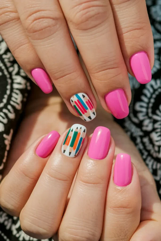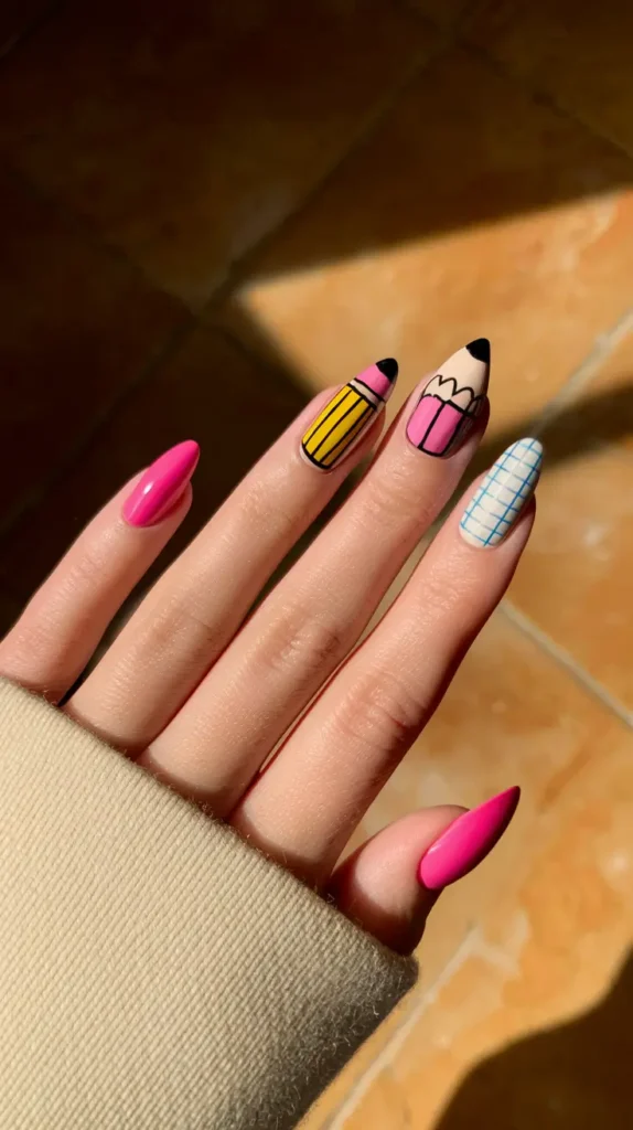 From pastel tips that scream “fresh start” to minimalist art that keeps things subtle but stylish, there’s a back-to-school nail look for everyone. Think doodle-inspired squiggles, pencil and notebook patterns, or even soft neutral shades that go with any outfit. Plus, shorter, rounded shapes are not only trendy but also practical for typing, writing, or flipping through notes.