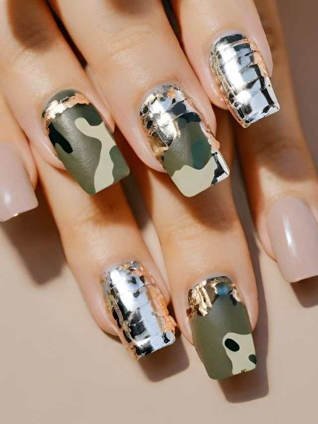 What makes camo nails so appealing is their incredible versatility. Classic army green camo delivers a rugged, confident look that pairs perfectly with neutral outfits and street-style fashion, while softer pastel camo designs create a playful, feminine twist on the trend. For those who love standing out, neon camo, monochrome black-and-white camo, or unexpected colour combinations transform this once-muted pattern into a true statement manicure. Whether glossy, matte, or mixed with textures like chrome accents or subtle glitter, camo nails can be customised to match your personality and mood.