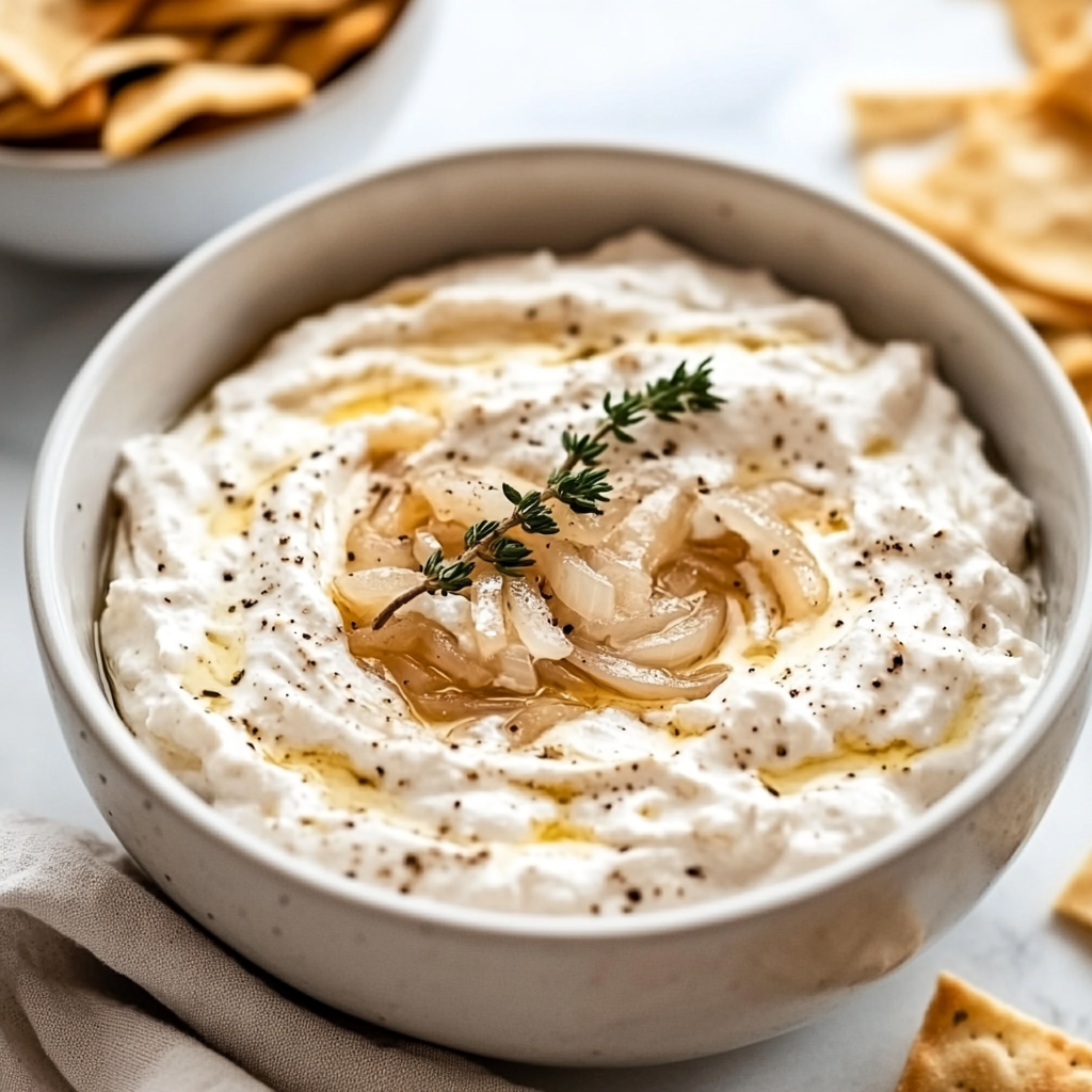 - In a mixing bowl, combine the caramelized onions, goat cheese, cream cheese, sour cream, and thyme. Mix until smooth.