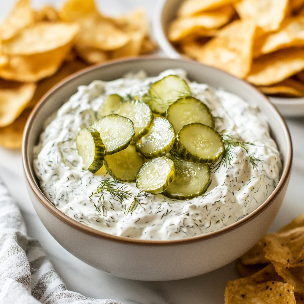 - In a mixing bowl, combine the softened cream cheese, chopped dill pickles, sour cream, Dijon mustard, and fresh dill.