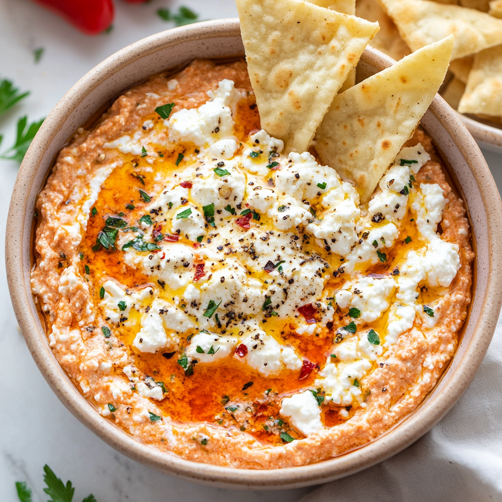 - In a food processor, combine the crumbled feta cheese, roasted red peppers, Greek yogurt, olive oil, red pepper flakes, minced garlic, salt, and pepper.