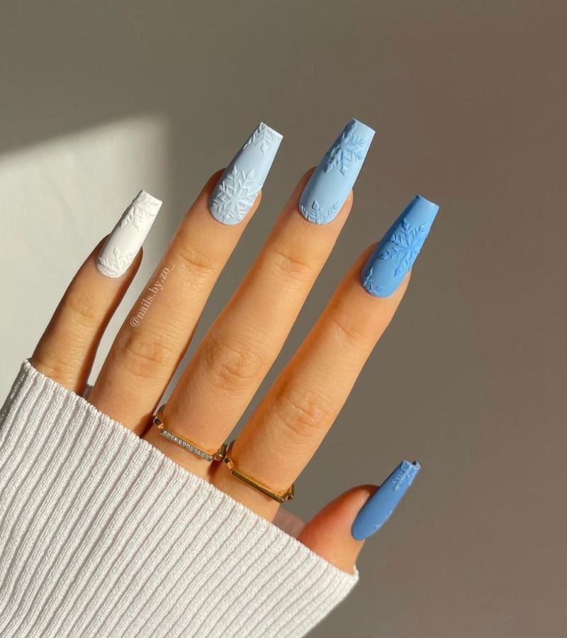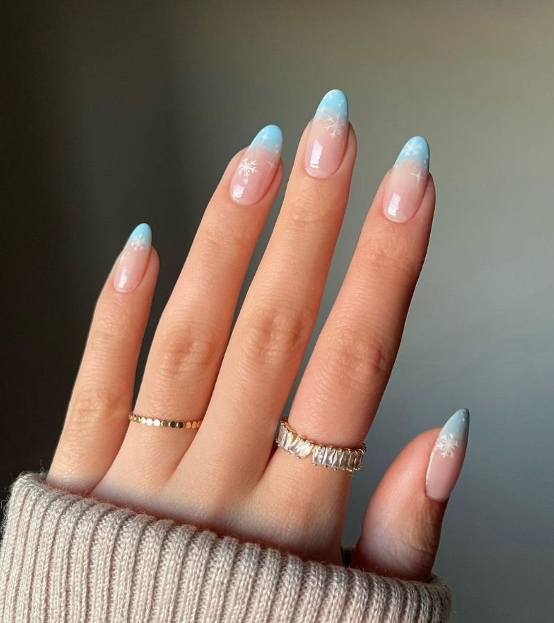Snowflakes, icy ombré fades, knitted sweater patterns, and delicate metallic lines add depth and interest without feeling overdone.