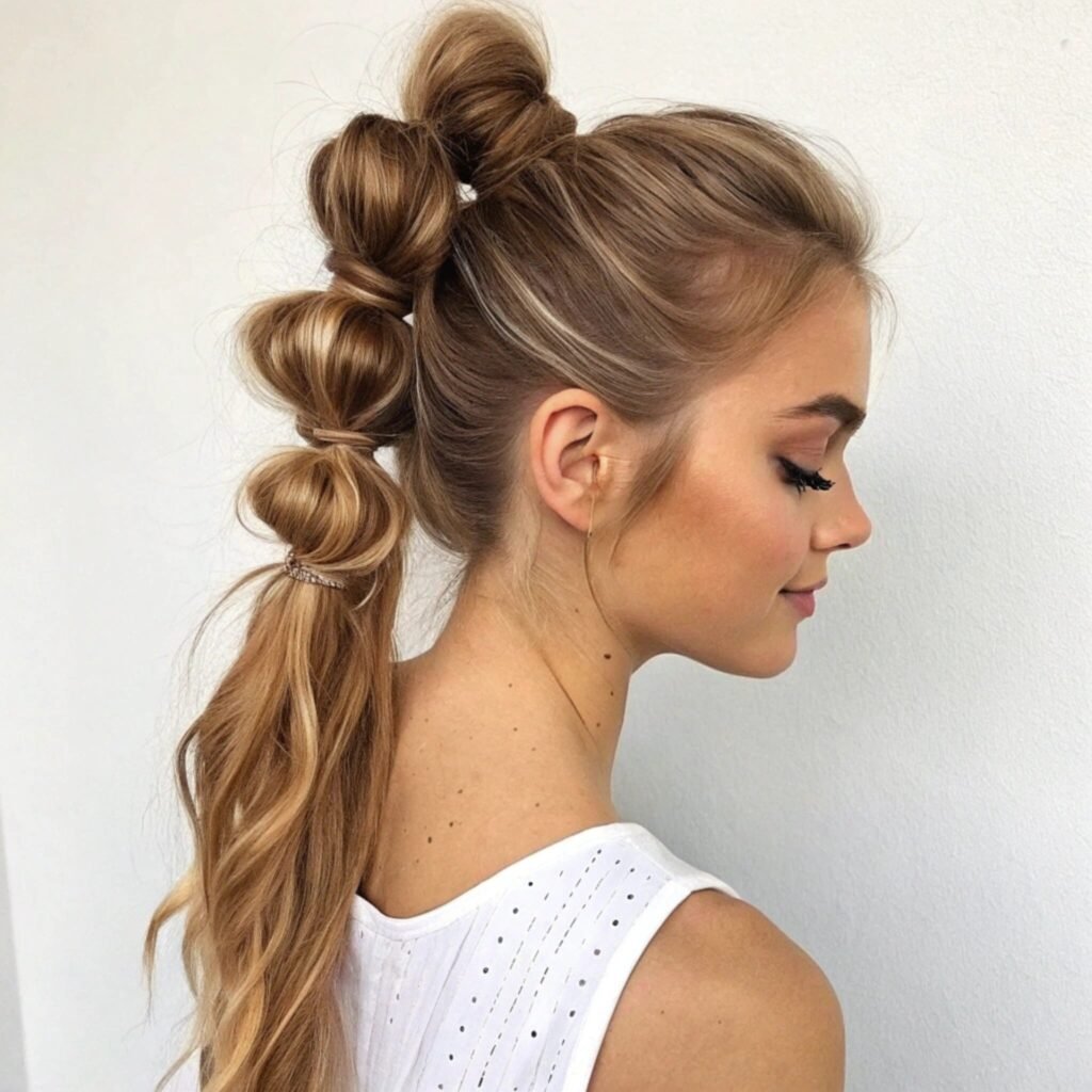 Playful, trendy, and super easy to pull off. This fun twist on the classic ponytail adds volume and personality with its cute “bubble” sections, making it perfect for both casual days and chic outings.
