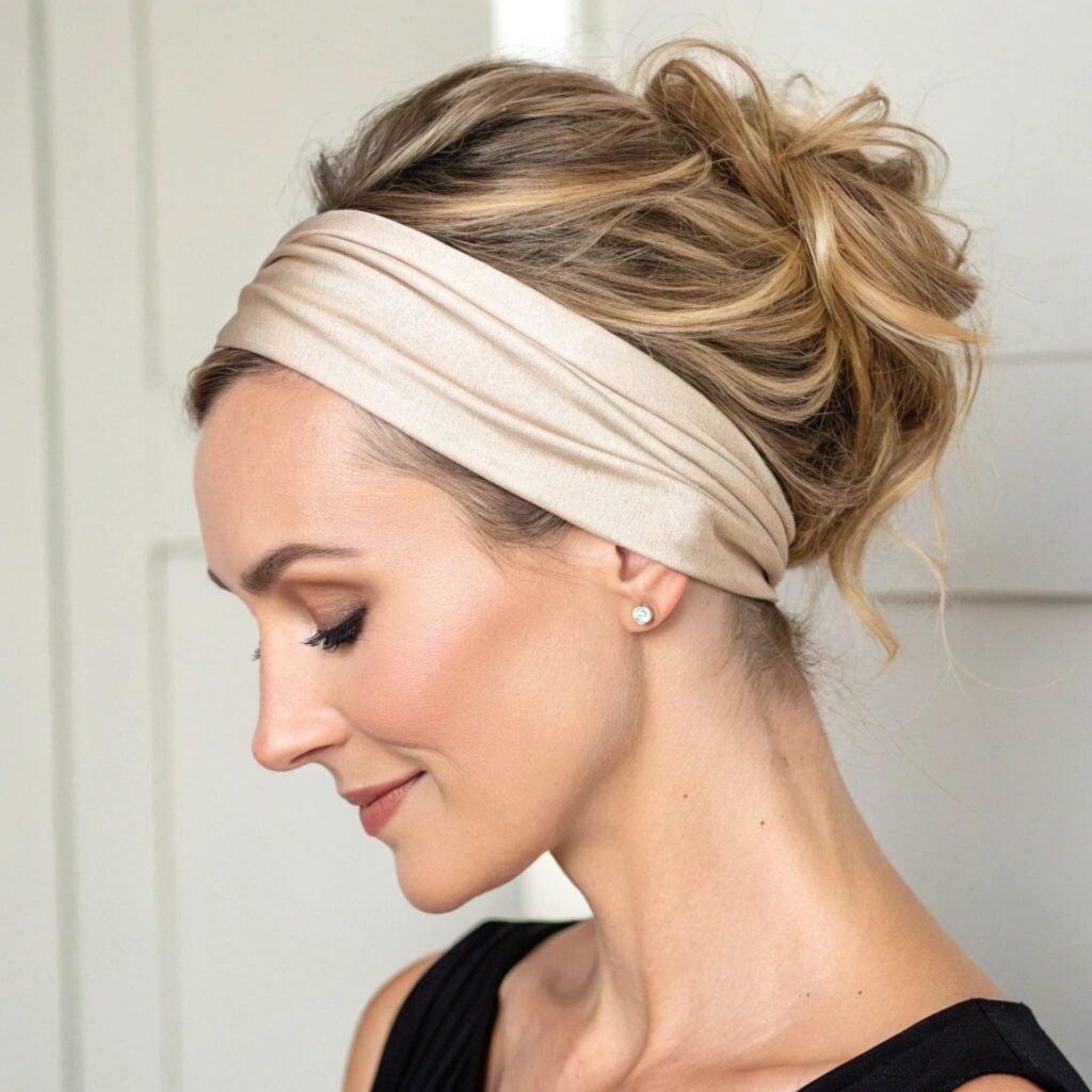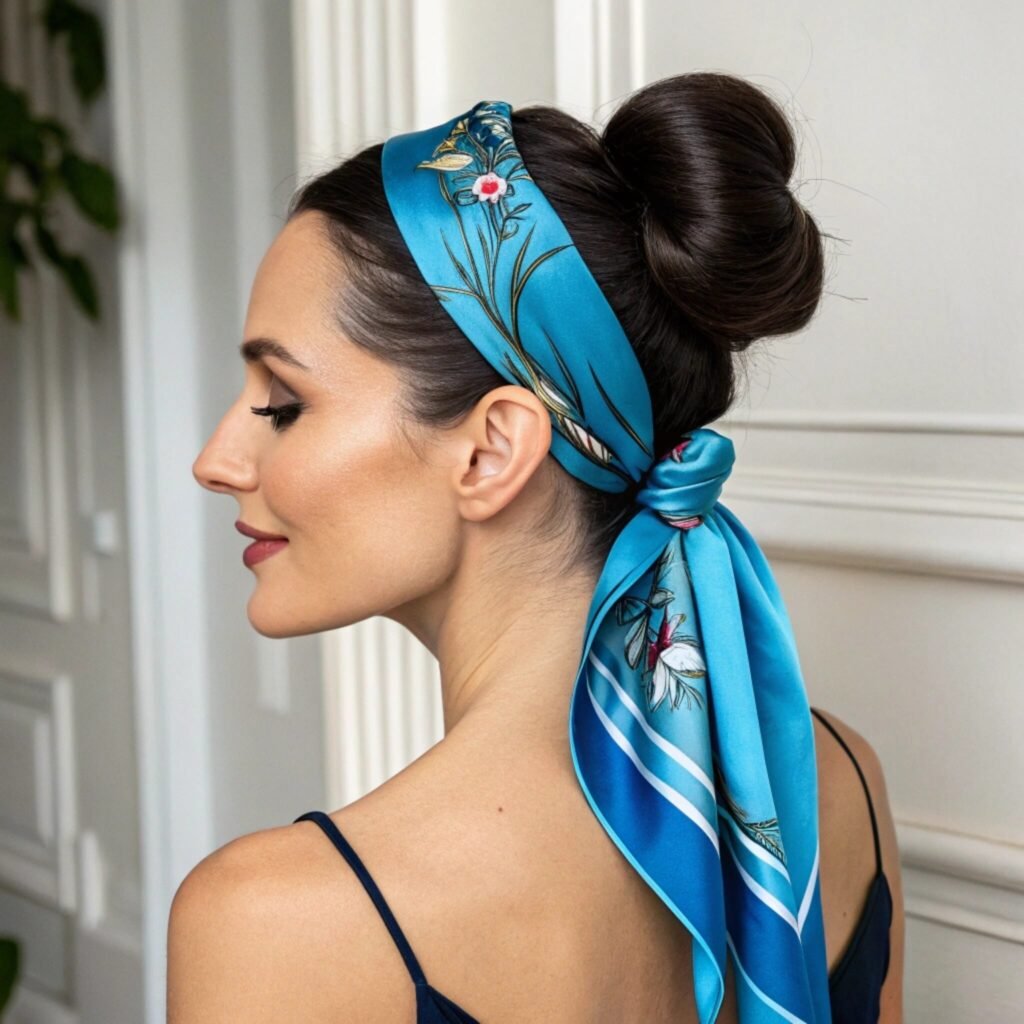 A chic twist on a classic updo. Adding a scarf instantly elevates the style, giving it a pop of color and personality while keeping things stylish and effortless.