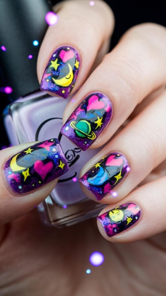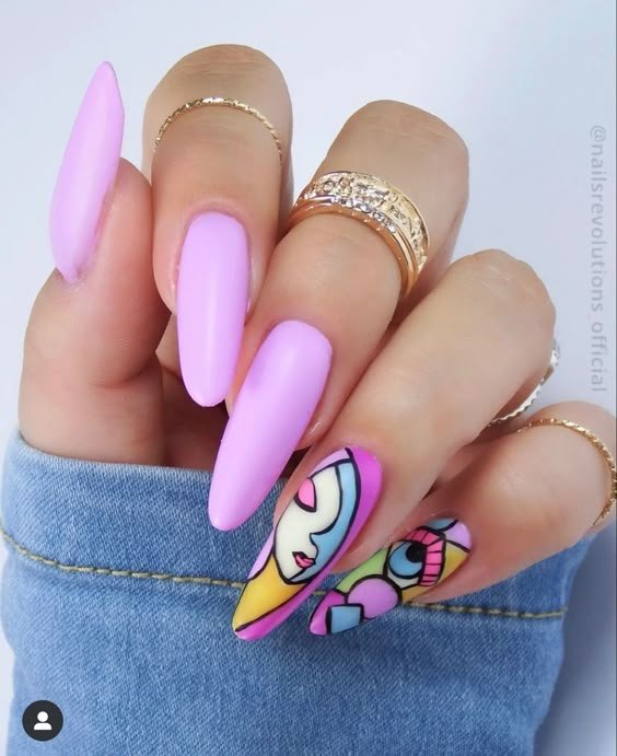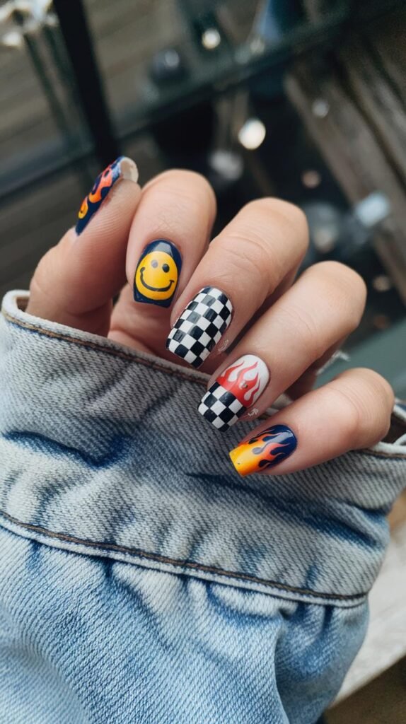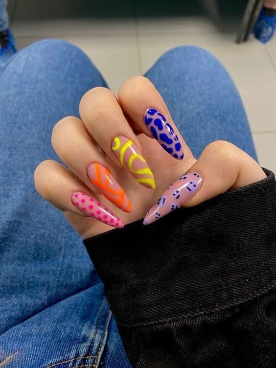 Almond, coffin, square, or stiletto shapes all lend themselves to funky looks — it’s not about the shape, but how creatively you use it. These designs are ideal for festivals, holidays, weekends, or anytime you want your nails to stand out and feel unapologetically fun.