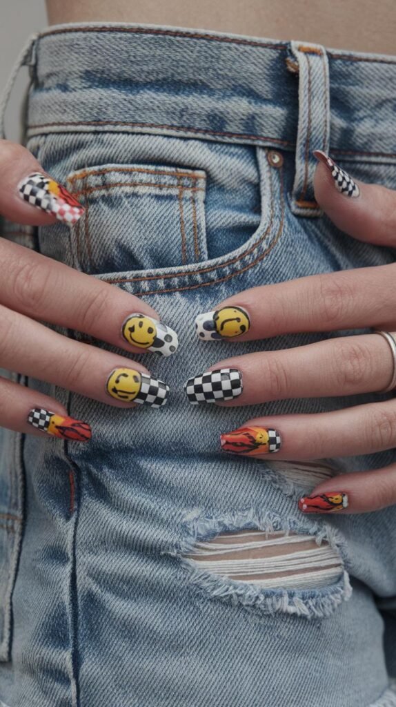 What makes funky nails so exciting is that there are no limits. Think swirls in contrasting colours, abstract shapes, checkerboard patterns, smiley faces, splashes of neon, graphic lines, and unexpected textures all living on the same set of nails. One nail might be glossy, another matte.