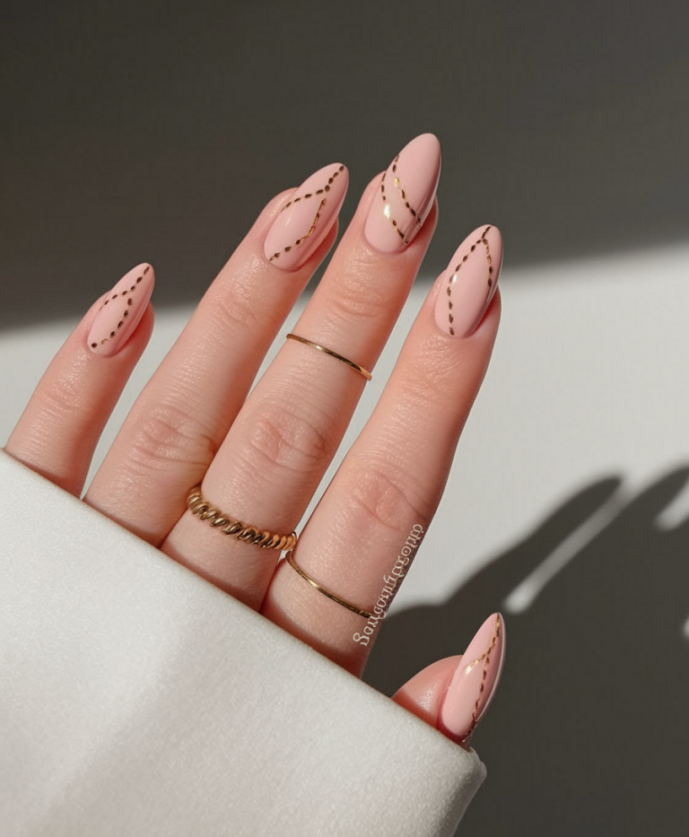 For an elegant yet understated finish, this chic graduation nail design showcases a gentle pink base accented with fine gold chain details. The almond shape enhances the length of the fingers, while the delicate gold accents bring a touch of refined luxury. Ideal for those who favor a minimalist yet striking look that leaves a lasting impression.