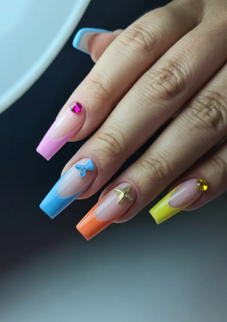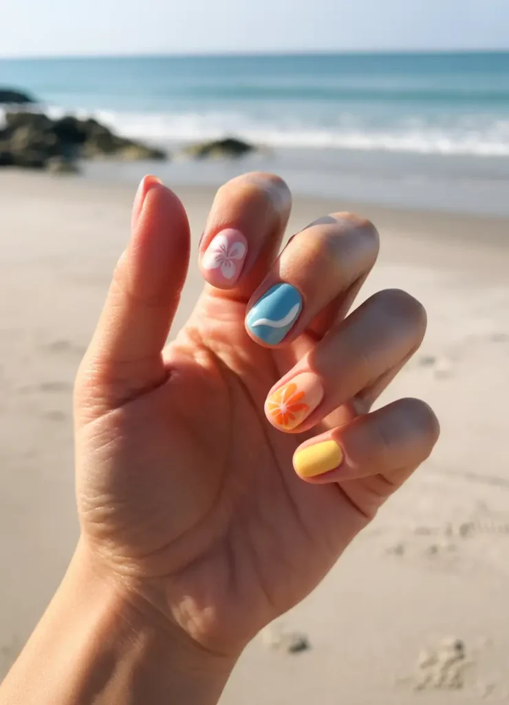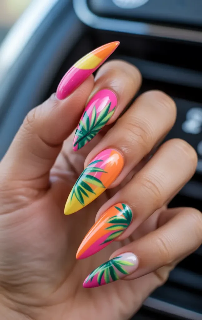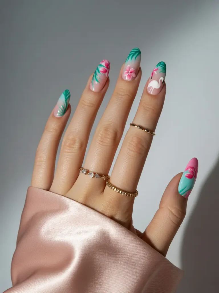 Think hibiscus flowers, palm leaves, sunsets, ocean waves, pineapples, and tropical birds. Bright shades like coral, turquoise, sunny yellow, hot pink, and ocean blue instantly give nails that warm, island-inspired feel.