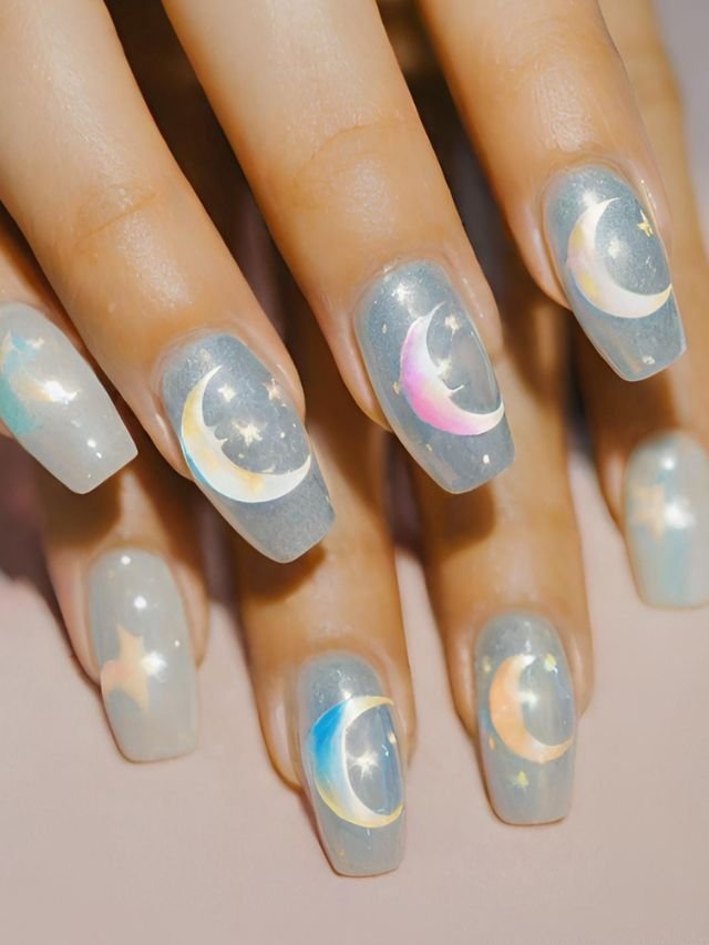 Inspired by lunar phases, starry skies, and deep night tones, moon nails often feature shades like midnight blue, soft silver, creamy white, and shimmering chrome.