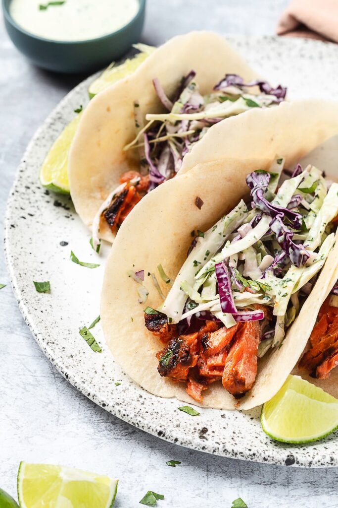 Bring bright, bold flavors to your taco night with these Cilantro Lime Salmon Tacos! Tender, flaky salmon marinated in a vibrant blend of lime juice, cilantro, and spices is grilled to perfection and nestled in warm tortillas. Topped with crisp slaw, creamy avocado, and a drizzle of tangy sauce, these tacos offer a perfect balance of freshness and indulgence.